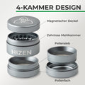 Gemaakt van hoogwaardig aluminium De koffiemolen maakt indruk met zijn stabiliteit, duurzaamheid en prettige gevoel. zilverkleurig oppervlak met HIZEN-logo Het zorgt bovendien voor een minimalistische en hoogwaardige uitstraling.